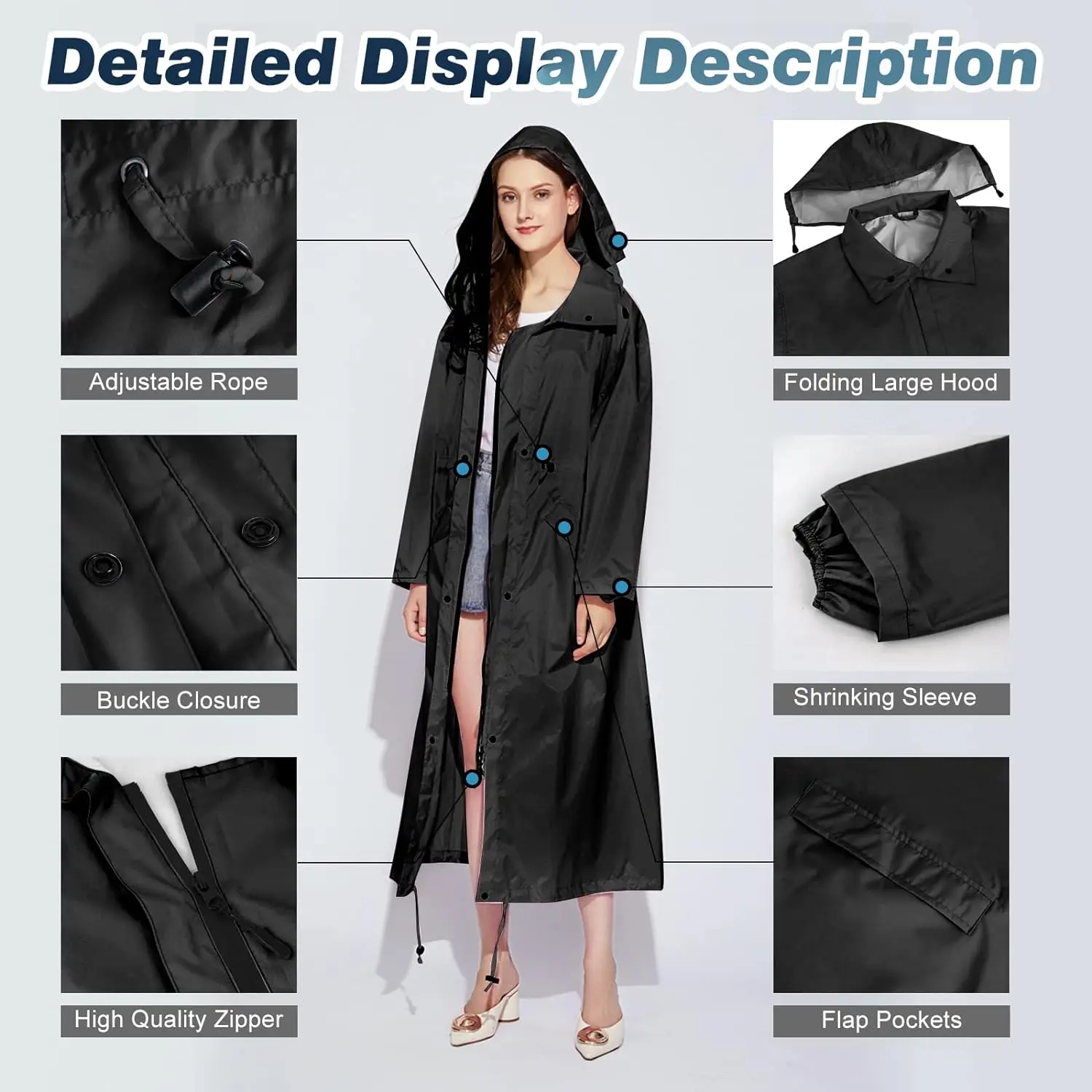 This women’s waterproof raincoat provides dependable protection during wet weather. The lightweight design makes it comfortable for daily wear or travel. A packable structure allows you to fold and store it easily in a bag. The adjustable waist creates a flattering and customizable fit. Its hooded design offers added coverage against rain and wind. The long length gives extra protection for your legs and clothing. Breathable fabric helps keep you dry without feeling overheated. It is perfect for outdoor activities such as hiking, commuting, or sightseeing. Durable stitching ensures long-lasting performance. This raincoat blends practicality, comfort, and style for year-round use.